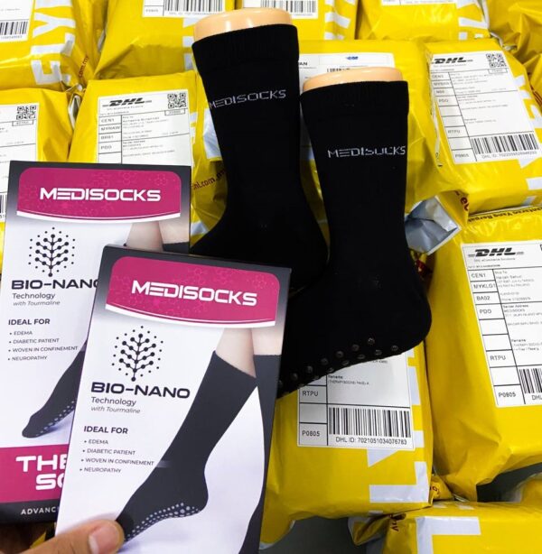 Therapy Socks by Medisocks merupakan stokin atau sarung kaki yang dihasilkan dengan teknologi Bio-Nano Tourmaline iaitu sejenis teknologi akupuntur moden bagi membantu melancarkan penggaliran darah sekaligus membantu masalah-masalah di kaki